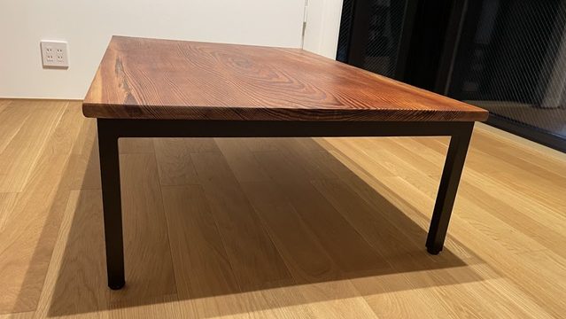 昭和初期から長年お使いの座卓。愛着がありながらも塗装剥げや脚の緩み反りなど不具合も多く、また建て替えのお部屋に合わないことから、天板面の再塗装と脚をアイアン脚に交換・リフォームさせていただきました
